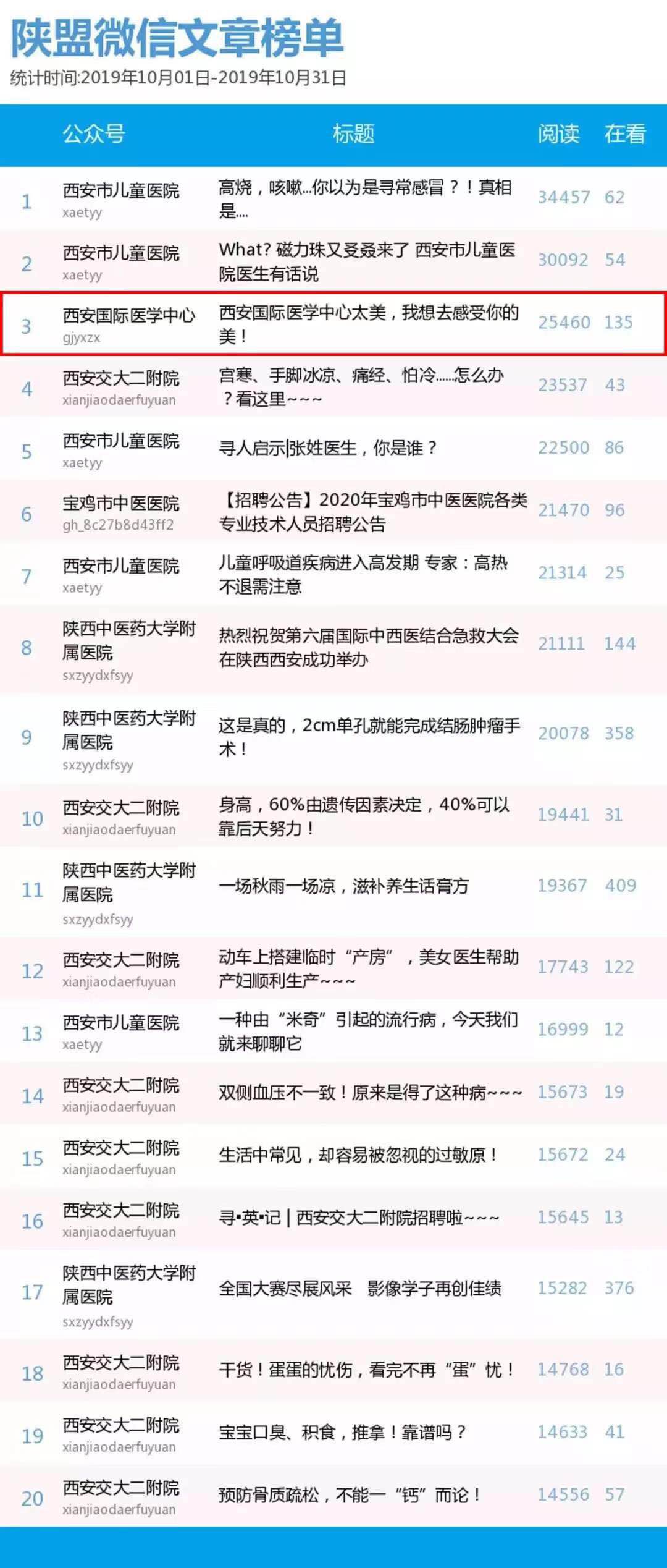 陜西醫(yī)療自媒體聯(lián)盟醫(yī)療機(jī)構(gòu)類微信公眾號2019年10月微信文章榜單第三名——《西安國際醫(yī)學(xué)中心太美,我想去感受你的美》。文章從醫(yī)院優(yōu)美的環(huán)境角度切入,詳細(xì)介紹了西安國際醫(yī)學(xué)中心的地理位置、建筑特色、就醫(yī)環(huán)境、名醫(yī)專家、醫(yī)療惠民等,最終獲得25460的閱讀量,位列第三。