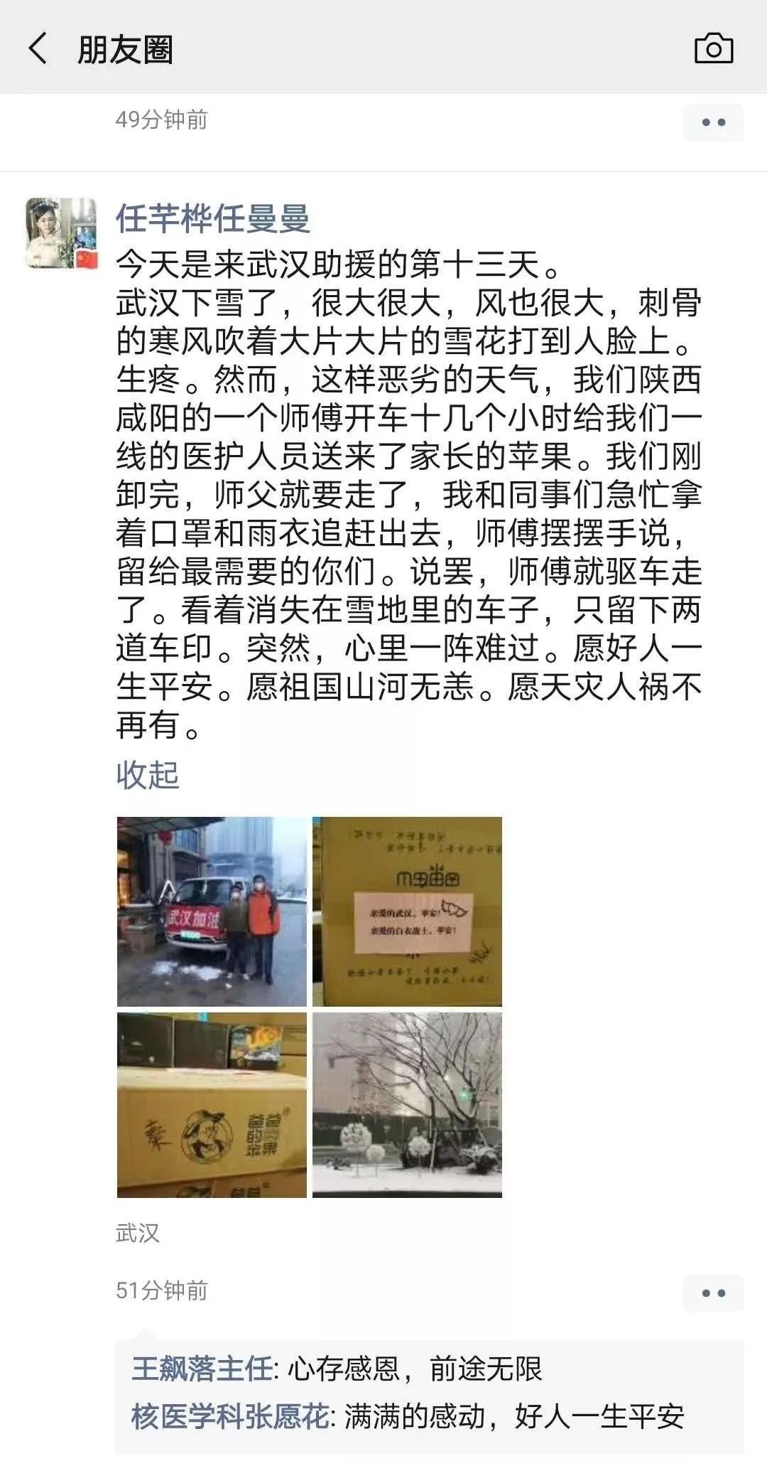 任曼曼久久不能平靜,在朋友圈里寫到:今天是來武漢援助的第十三天。武漢下雪了,很大很大,風(fēng)也很大,刺骨的寒風(fēng)吹著大片大片的雪花打到人臉上,生疼。然而,這樣惡劣的天氣,我們陜西咸陽的一個師傅開車十幾小時給我們一線的醫(yī)護(hù)人員送來了家鄉(xiāng)的蘋果。我們剛卸完,師傅就要走了,我和同事們急忙拿著口罩和雨衣追趕出去,師傅擺擺手說給最需要的你們。說罷,師傅就驅(qū)車走了??粗г谘┑乩锏能囎樱涣粝聝傻儡囉?。突然,心里一陣難過。愿好人一生平安,愿祖國山河無恙,愿天災(zāi)人禍不再有!