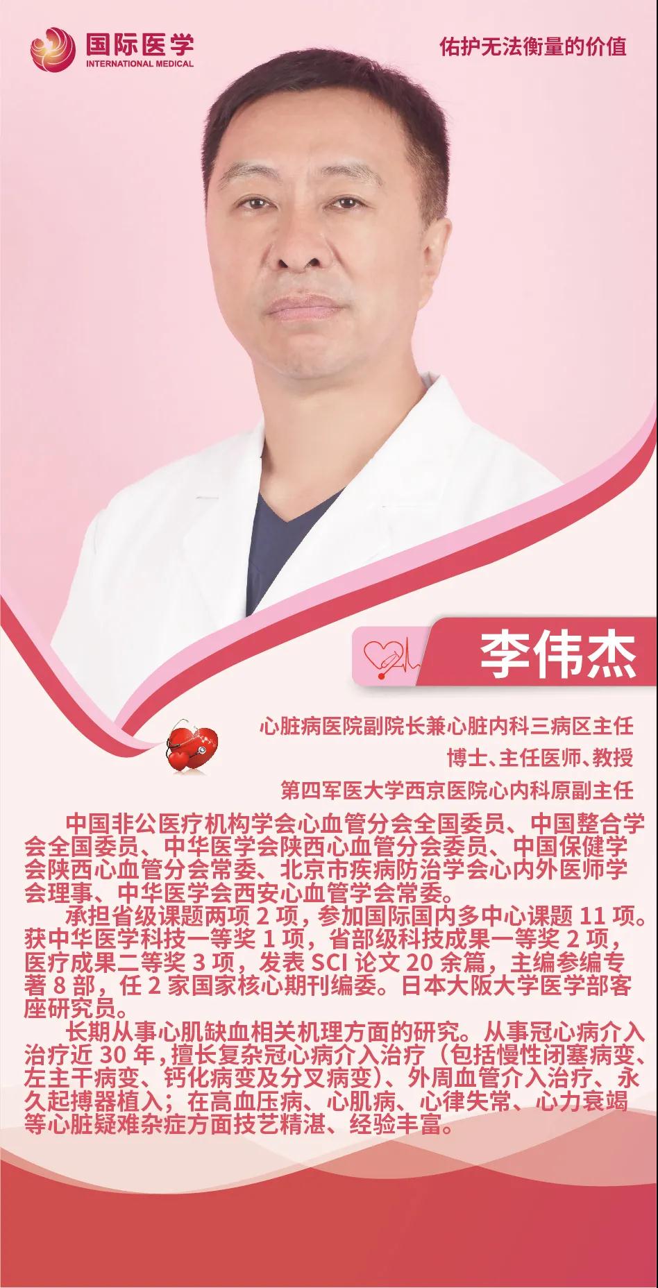 李偉杰,第四軍醫(yī)大學(xué)西京醫(yī)院心內(nèi)科原副主任,博士、主任醫(yī)師、教授。先后承擔(dān)了多項(xiàng)國(guó)際國(guó)內(nèi)及省部級(jí)課題,獲得過中華醫(yī)學(xué)科技一等獎(jiǎng)等多重獎(jiǎng)項(xiàng),長(zhǎng)期從事于血管管介入治療,擅長(zhǎng)冠心病復(fù)雜病變的介入手術(shù)治療,包括慢性閉塞病變、左主干病變、鈣化病變及分叉病變,在外周血管的介入治療級(jí)其他心血管疾病的診療方面具有非常豐富的經(jīng)驗(yàn)。李偉杰在西京醫(yī)院工作多年,掛號(hào)一票難求,因和藹可親的態(tài)度、精湛的醫(yī)技、崇厚的醫(yī)德獲得了一大批的患者“粉絲”,是患者口中的明星醫(yī)生,醫(yī)生口中的業(yè)界“男神”。