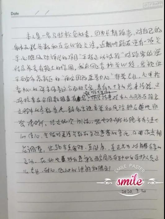 “本人是一名馬拉松愛好者,因?yàn)殚L(zhǎng)期跑步對(duì)自己的身體機(jī)能參數(shù)和反應(yīng)比較關(guān)注,近期聽朋友說有一項(xiàng)關(guān)于心臟風(fēng)險(xiǎn)評(píng)估的項(xiàng)目。我在網(wǎng)上查找并比較發(fā)現(xiàn),平板運(yùn)動(dòng)試驗(yàn)對(duì)跑步的評(píng)估及參數(shù)有較大的作用,西安國(guó)際醫(yī)學(xué)中心醫(yī)院非常專業(yè),心電檢查中心的張錄興主任是這方面的專家,具有幾十年的臨床經(jīng)驗(yàn),這項(xiàng)檢查在全國(guó)都相當(dāng)有名。今天通過這項(xiàng)檢查評(píng)估結(jié)果,對(duì)心臟在跑步過程中的參數(shù)變化,是否會(huì)出現(xiàn)異常和風(fēng)險(xiǎn),都反饋得非常清晰,經(jīng)過這次測(cè)試后,我也對(duì)今后的跑步有了更大的信心,會(huì)隨時(shí)關(guān)注參數(shù)和主觀感受的變化,日后會(huì)做出相應(yīng)的調(diào)整,讓跑步更合理,更健康,真正地成為對(duì)身體有益的運(yùn)動(dòng),在此也非特別感謝西安國(guó)際醫(yī)學(xué)中心醫(yī)護(hù)人員這么專業(yè)、耐心熱情的講解和服務(wù)?!?