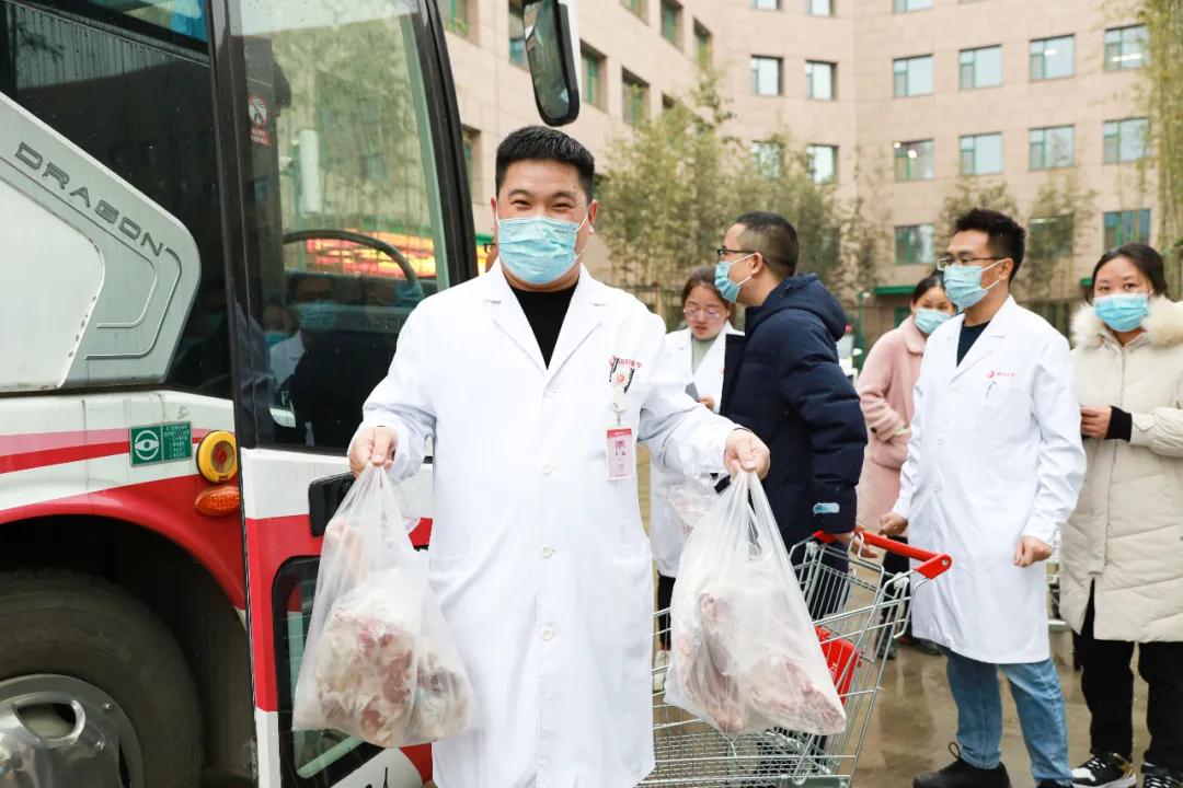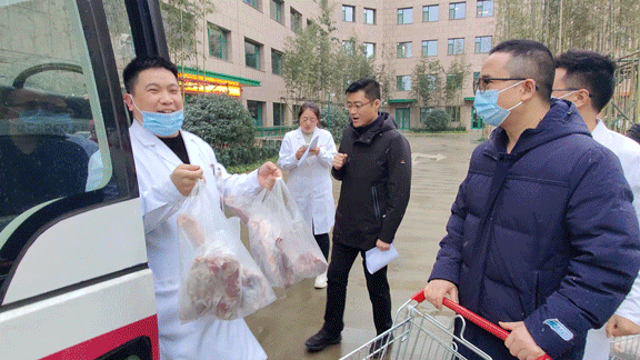 當(dāng)日上午,蒙古國(guó)捐贈(zèng)的486箱冷凍羊乘“接運(yùn)專車”到達(dá)陜西西安。按照國(guó)家統(tǒng)一部署,羊經(jīng)過(guò)嚴(yán)格檢驗(yàn)檢疫加工后轉(zhuǎn)運(yùn)陜西省,分配給前往湖北參與新冠肺炎疫情醫(yī)療救治工作的醫(yī)療隊(duì)員。我院收到100箱捐贈(zèng)羊。下午五點(diǎn),張良院長(zhǎng)助理帶領(lǐng)綜合辦公室工作人員,將一袋袋羊肉發(fā)到醫(yī)療隊(duì)隊(duì)員們手中。