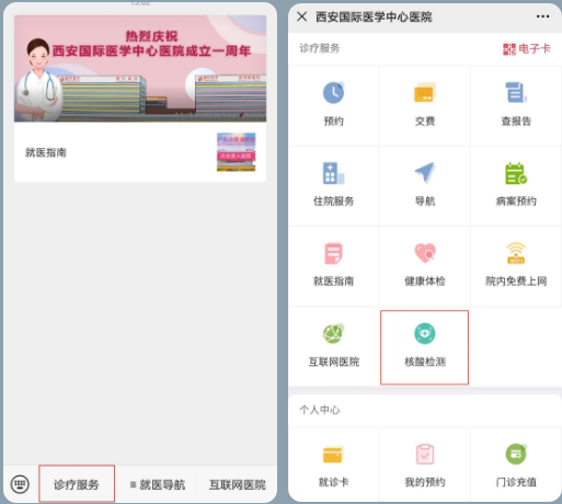 有需要住院、陪護的應檢盡檢或愿檢盡檢人群,可關注“西安國際醫(yī)學中心醫(yī)院服務號”后,在【診療服務】——【核酸檢測】功能中自助開單,支付后前往西安國際醫(yī)學中心醫(yī)院急診門口預檢分診點北側(cè)核酸檢測室完成采樣檢測。檢測結(jié)果可在西安國際醫(yī)學中心醫(yī)院服務號——【診療服務】——【查報告】中查看,也可在“西安市民一碼通”——【核酸結(jié)果查詢】中查看。