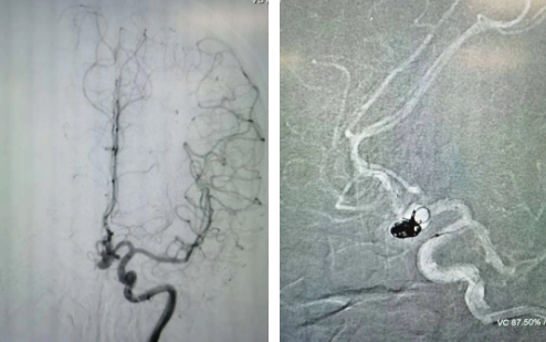 腦血管較外周血管更為脆弱、迂曲,對術(shù)者的操作技術(shù)及精準(zhǔn)性要求特別高。術(shù)中,陸丹醫(yī)生通過股動脈穿刺、置入微導(dǎo)管,再通過微導(dǎo)管將彈簧圏送入動脈瘤腔內(nèi),利用彈簧圈的機(jī)械閉塞作用,達(dá)到防止動脈瘤破裂的目的。術(shù)后,患者各項(xiàng)生命體征平穩(wěn)。