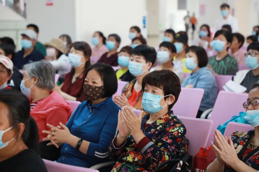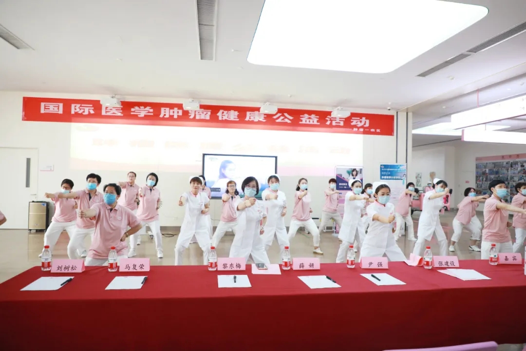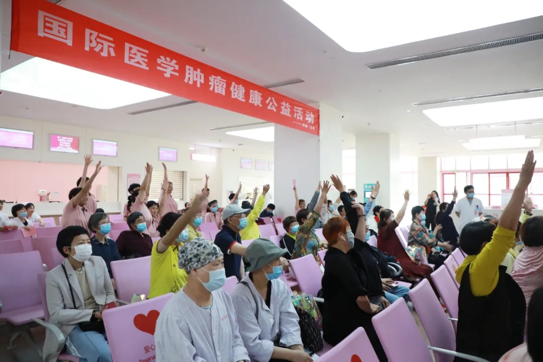 腫瘤一病區(qū)的醫(yī)護人員和志愿者們共同演練了一段八段錦,隨后的健康知識問答和歌曲快閃環(huán)節(jié)將活動氛圍推向高潮,大家爭先恐后地舉手搶答,現(xiàn)場問答也促進了對于腫瘤防治、康復(fù)知識的推廣。最后,大家合唱歌曲“相信我們會創(chuàng)造奇跡”,積極、歡樂的氛圍縈繞不息?;顒幼詈螅﹀痹洪L、劉樹松教授和張俊美醫(yī)生對患者的提問進行了耐心、細(xì)致的解答。
