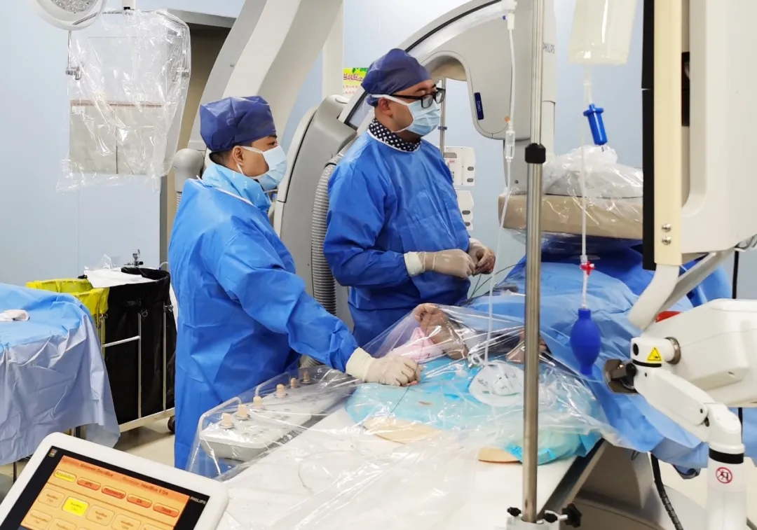 入手術(shù)室時,患者神志迷糊,口唇干燥、重度貧血貌,心電監(jiān)護提示:心率140-160次/分,血壓70/43mmHg,這是失血性休克的表現(xiàn)!白葦快速建立靜脈通道緊急給予輸血,升壓,止血等液,立即給予肝動脈造影,術(shù)中發(fā)現(xiàn)肝左葉疑似腫瘤病灶、病灶周圍血管分支有造影劑外溢,考慮血管破裂出血,迅速給予栓塞微球進行肝動脈栓塞。整個手術(shù)過程不足20分鐘,術(shù)后即刻患者心率降至100-110次/分、血壓升至90/60mmHg。