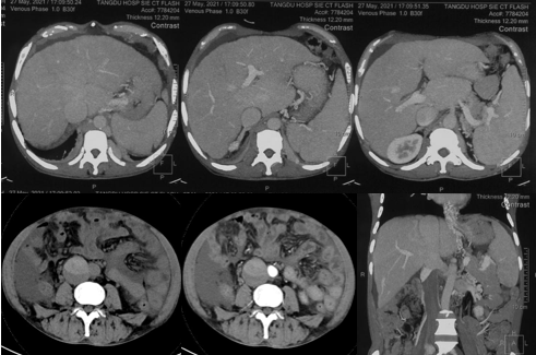 6月20日,患者及家屬懷揣著忐忑的心情來(lái)到西安國(guó)際醫(yī)學(xué)中心醫(yī)院找到韓國(guó)宏教授,韓教授詢問(wèn)病情后閱患者外院CT片,明確診斷布加綜合征,同時(shí)發(fā)現(xiàn)了一個(gè)新的問(wèn)題,在詢問(wèn)病史時(shí)了解到患者近一周雙下肢乏力伴腫脹明顯加重,遂立即安排了急診CT,證實(shí)下腔靜脈內(nèi)急性血栓形成!