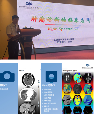 授牌儀式后即開始精彩的學(xué)術(shù)講座,首先,山西醫(yī)科大學(xué)第一醫(yī)院影像科喬英教授分享了“IQon光譜CT在腫瘤診斷的臨床應(yīng)用”。喬教授指出IQon Spectral CT的光譜重建可以提供多參數(shù)數(shù)據(jù),如單能級圖像、無水碘圖、有效原子序數(shù)值等,更加清晰的觀察病灶范圍,更加精準(zhǔn)的發(fā)現(xiàn)小病灶、進行腫瘤分期及術(shù)后療效評估。