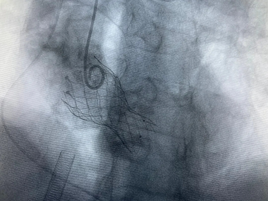 門診心臟彩超提示:聲像圖所見考慮為非對(duì)稱性肥厚型心肌?。ㄗ笫伊鞒龅婪逯祲毫﹄A差14mmHg),主動(dòng)脈瓣狹窄(峰值壓力階差125mmHg)伴關(guān)閉不全(返流5.4ml)并鈣化;左室前壁厚度22mm;左室前后徑32/46mm。在完善相關(guān)檢查、考量遠(yuǎn)期效果和權(quán)衡手術(shù)風(fēng)險(xiǎn)及獲益后,張金洲副院長(zhǎng)團(tuán)隊(duì)為老人選擇了創(chuàng)傷最小、風(fēng)險(xiǎn)最低的TAVR手術(shù)。