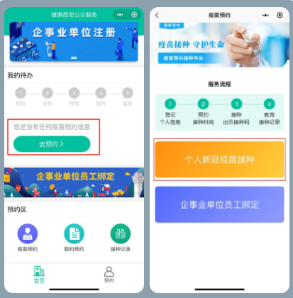 點擊【我的】,根據(jù)指示進行實名制信息注冊,注冊完成后點擊【首頁】,選擇【去預(yù)約】,然后選擇【個人新冠疫苗接種】。