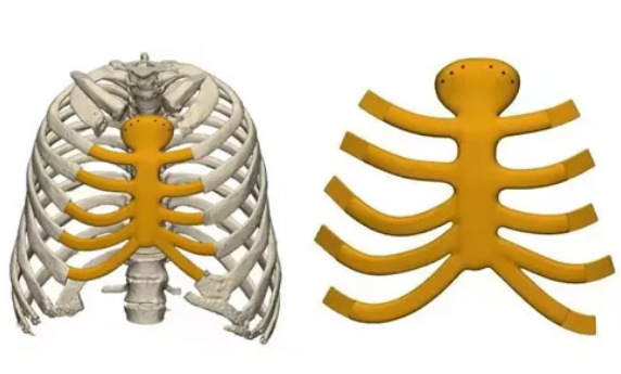 由于惡性腫瘤已經(jīng)侵蝕患者胸骨,且患者既往縱劈胸骨手術(shù),手術(shù)中不得不行全胸骨切除置換,因此需要使用人工胸壁置換術(shù)。西安國際醫(yī)學(xué)中心醫(yī)院打破傳統(tǒng)植入方式,通過分析患者增強(qiáng)CT掃描資料,計算出腫瘤大小,切除范圍及切除后需要植入材料的大小形狀,并通過3D打印技術(shù)制作出和患者解剖結(jié)構(gòu)完全相同的植入材料,植入物采用國際上先進(jìn)的聚醚醚酮(PEEK)材料,其力學(xué)結(jié)構(gòu)接近人體皮質(zhì)骨,具有重塑胸壁力學(xué)的顯著特性。由此來制作人工胸廓替代胸骨和部分肋骨。