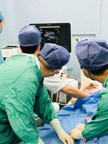 為了更好的服務(wù)患者,確保每一位患者都能得到最適合自己的治療方案,心臟外科二病區(qū)程亮主任團(tuán)隊聯(lián)合超聲診療中心韓增輝副主任團(tuán)隊,于8月2日為一位75歲老人在超聲引導(dǎo)下順利完成下行腔靜脈濾器置入術(shù)?;颊呷∑脚P位,右髖外旋,右膝略屈,右側(cè)腹股溝常規(guī)消毒鋪巾,2%利多卡因5ml局部麻醉,右側(cè)股靜脈穿刺,置入導(dǎo)絲,確認(rèn)導(dǎo)絲進(jìn)入下腔靜脈,順導(dǎo)絲置入鞘管,拔出導(dǎo)絲,確認(rèn)鞘管頂端位于腎靜脈水平以下、匯合部以上的下腔靜脈腔內(nèi),以頂桿推入濾器至鞘管頂端,超聲定位,釋放濾器,超聲觀察:濾器打開順利,位置正常,形態(tài)良好,彩色血流示:顯示濾器內(nèi)血流通暢。