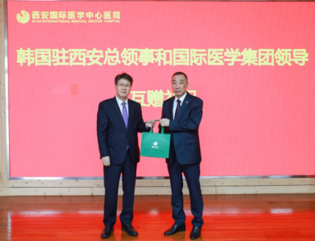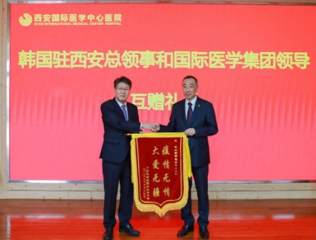 隨后,韓國駐西安總領事館向西安國際醫(yī)學中心醫(yī)院贈送錦旗,雙方互贈禮物并合影留念。
