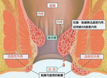 1.痔瘡便血 危害表現(xiàn)為便血、滴血,以及嚴(yán)重的噴血將導(dǎo)致頭暈、貧血等。