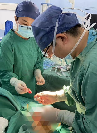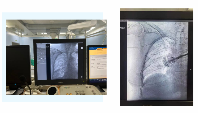 在麻醉手術(shù)中心的配合下,手術(shù)首先由韓海靜護(hù)士長在超聲引導(dǎo)下應(yīng)用“塞丁格”法穿刺將針尖一樣細(xì)的導(dǎo)絲送入血管,術(shù)中在DSA透視下將導(dǎo)管沿著血管送達(dá)上腔靜脈,尖端精準(zhǔn)定位至上腔靜脈開口處。隨后,胸腔外科支亞男主治醫(yī)師在穿刺點下方取2厘米小切口內(nèi)進(jìn)行上臂港囊袋和隧道的制作及導(dǎo)管與港座連接,最后進(jìn)行港體埋植及皮內(nèi)縫合,使患者切口隱蔽美觀創(chuàng)傷小,術(shù)中出血量極少。手術(shù)在X片影像留影,最終手術(shù)順利完成。