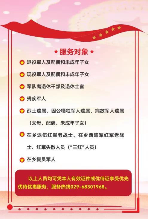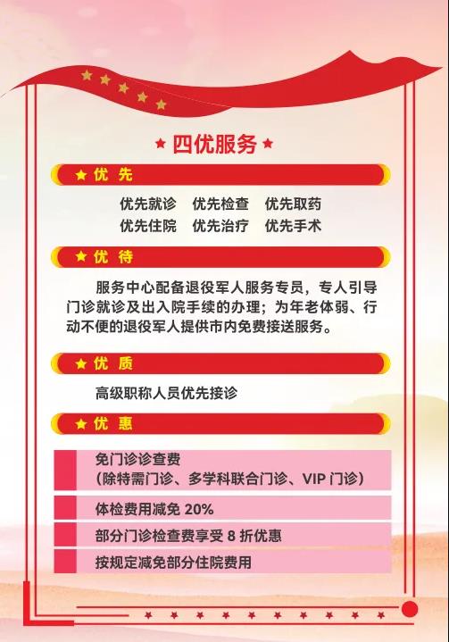 長期以來,醫(yī)院把“尊崇軍人,致敬軍屬”落到實處。一是對退役軍人實行優(yōu)撫。對退、現(xiàn)役軍人及其配偶和未成年子女;因公犧牲軍人直系親屬;軍隊離退休干部及退休士官;在鄉(xiāng)退伍紅軍老戰(zhàn)士、在鄉(xiāng)西路軍紅軍老戰(zhàn)士、“三紅”人員;殘疾軍人;在鄉(xiāng)復(fù)員軍人等優(yōu)撫對象來院享受門診就診優(yōu)先;住院優(yōu)先;窗口手續(xù)辦理優(yōu)先;檢驗檢查優(yōu)先;城區(qū)范圍內(nèi)救護車免費接送(預(yù)約電話:029—966120);特殊人員一對一陪診。二是優(yōu)撫對象就診時享受免門診診查費;部分門診檢查費享受8折優(yōu)惠;體檢費用減免20%;按規(guī)定減免部分住院費用。