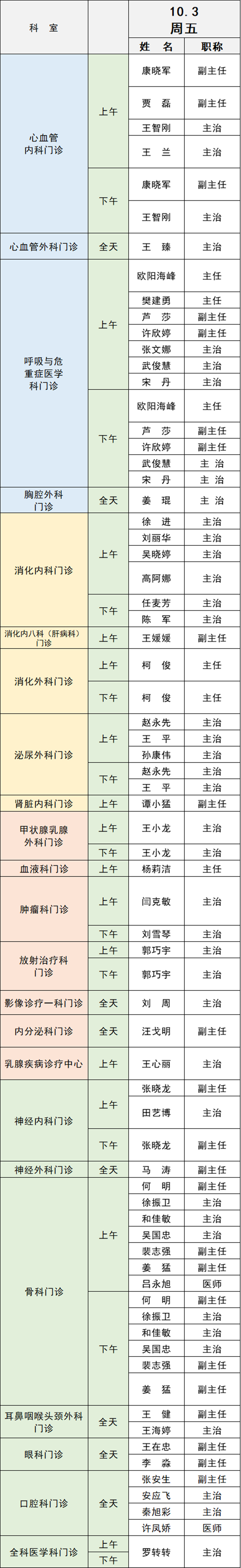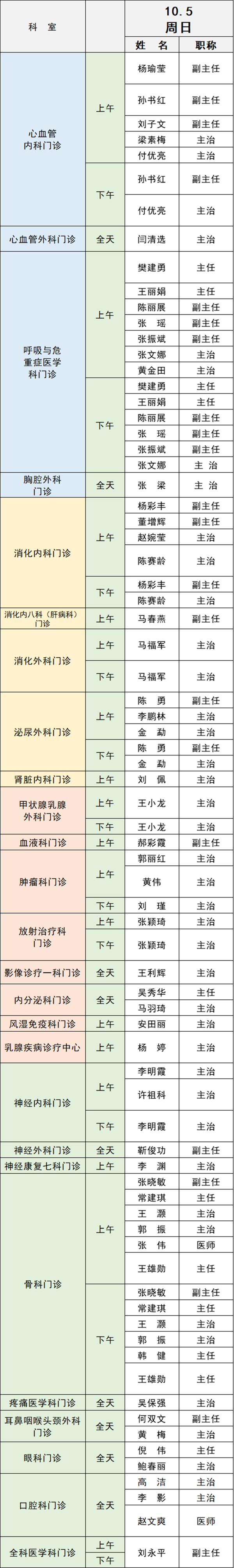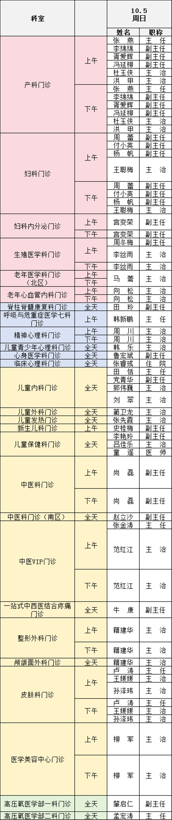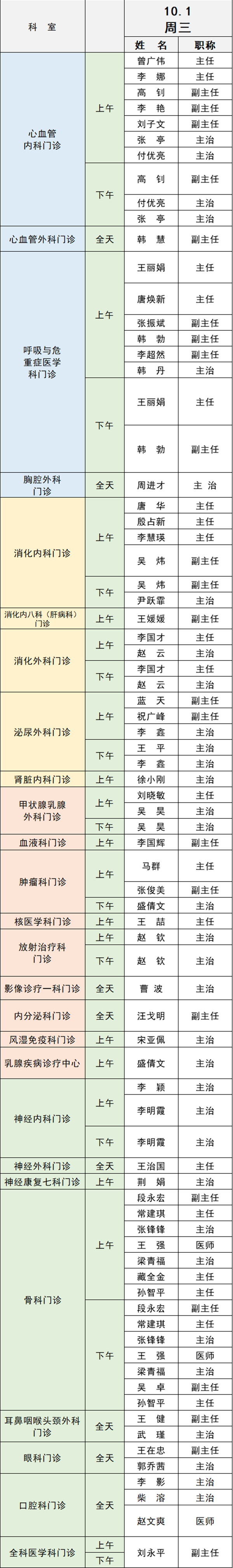 備注:實(shí)際出診情況以醫(yī)院掛號(hào)平臺(tái)實(shí)時(shí)信息為準(zhǔn)。“職稱”欄里主任=主任醫(yī)師副主任=副主任醫(yī)師主治=主治醫(yī)師