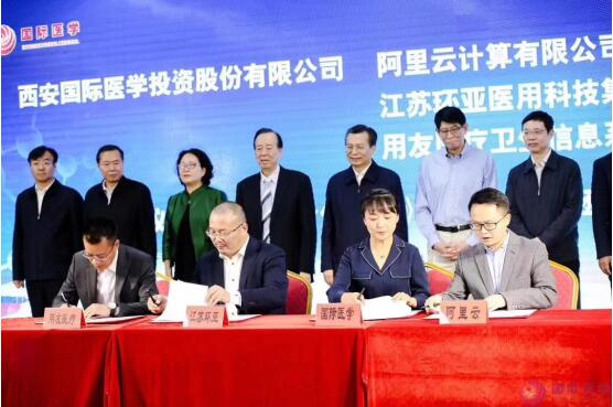 王永康書記等領(lǐng)導和嘉賓們首先參加了西安國際醫(yī)學中心的項目封頂儀式。在打造“ 一帶一路”國際醫(yī)療中心的啟動儀式上,國際醫(yī)學董事長史今代表公司與西安電子科技大學校長楊宗凱、英國國王學院代表簽訂《共建國際醫(yī)學院合作框架協(xié)議》;與阿里云簽訂《落地實施協(xié)議》、與江蘇環(huán)亞簽訂《信息化合作協(xié)議》、與用友醫(yī)療簽訂《信息化集團管控項目實施協(xié)議》。